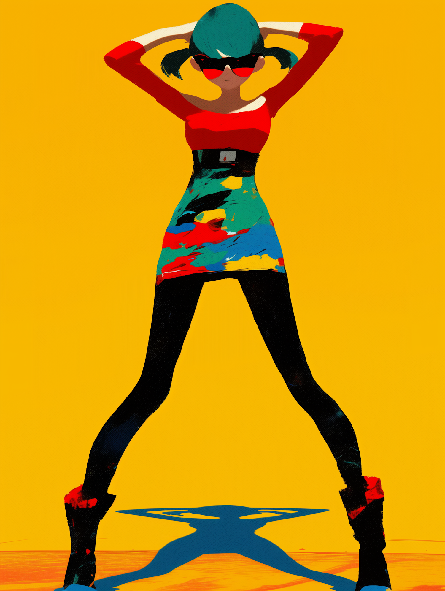 Stylized illustration of a colorful figure with teal hair, red sunglasses, and a vibrant outfit against a bright yellow background.