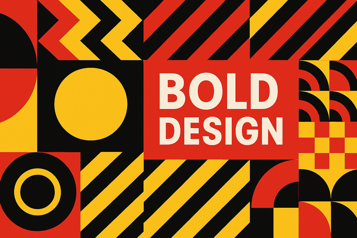 Bold geometric design with red, yellow, and black shapes, featuring the text 'BOLD DESIGN' in white. Perfect for modern design inspiration.