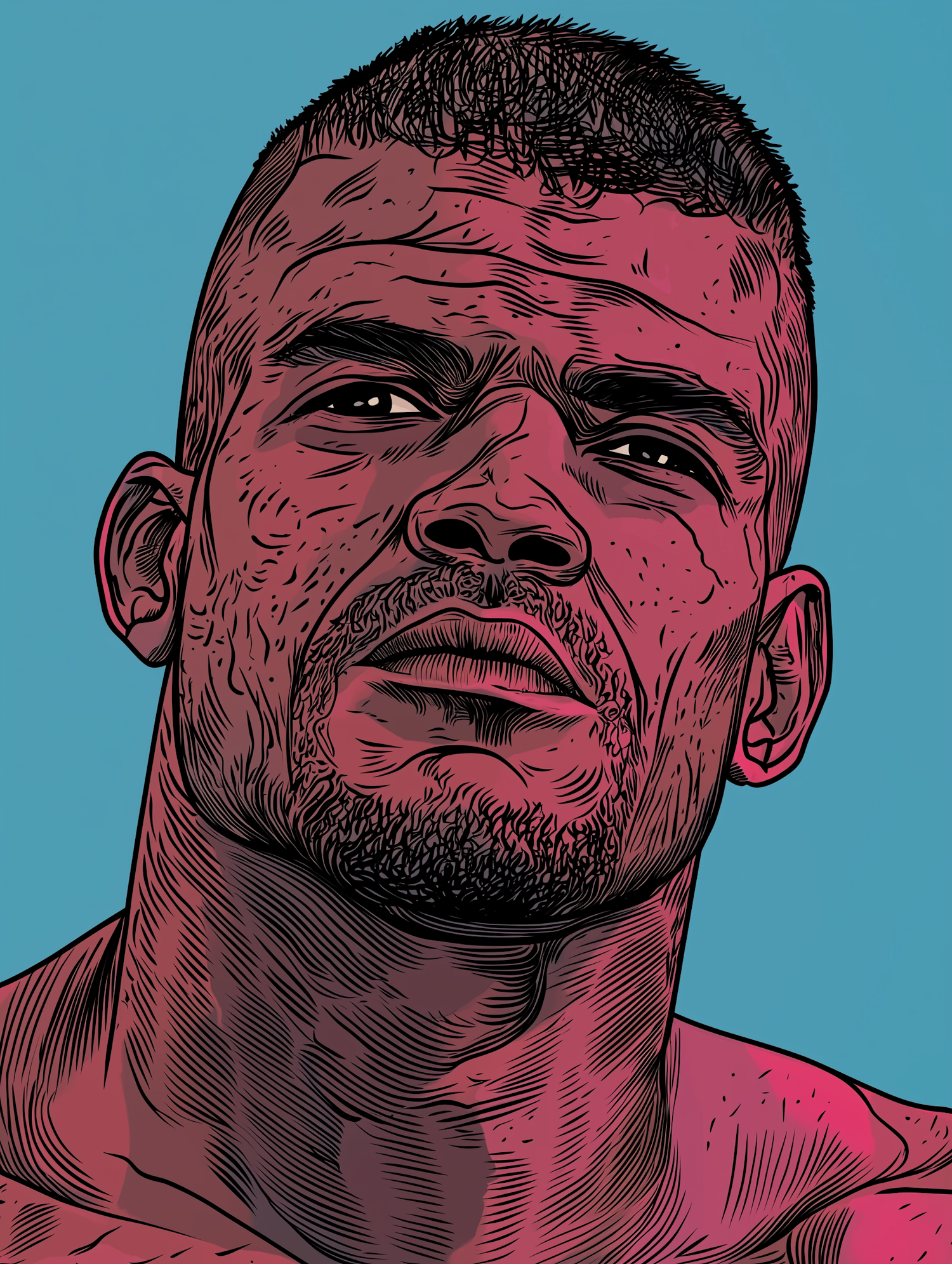 Bold illustration of a muscular man with intense expression, reddish tones, and a light blue background. Striking and detailed artwork.