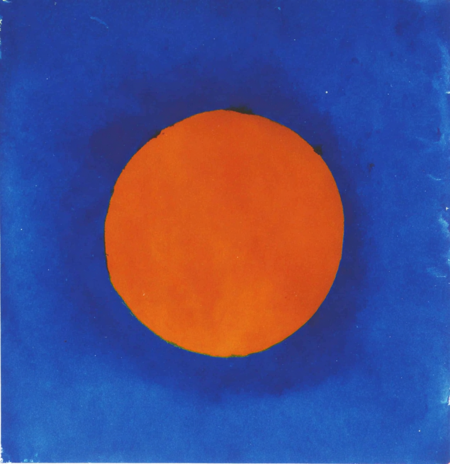 Abstract artwork with a bold orange circle on a textured blue background, showcasing a striking contrast and minimalist design.