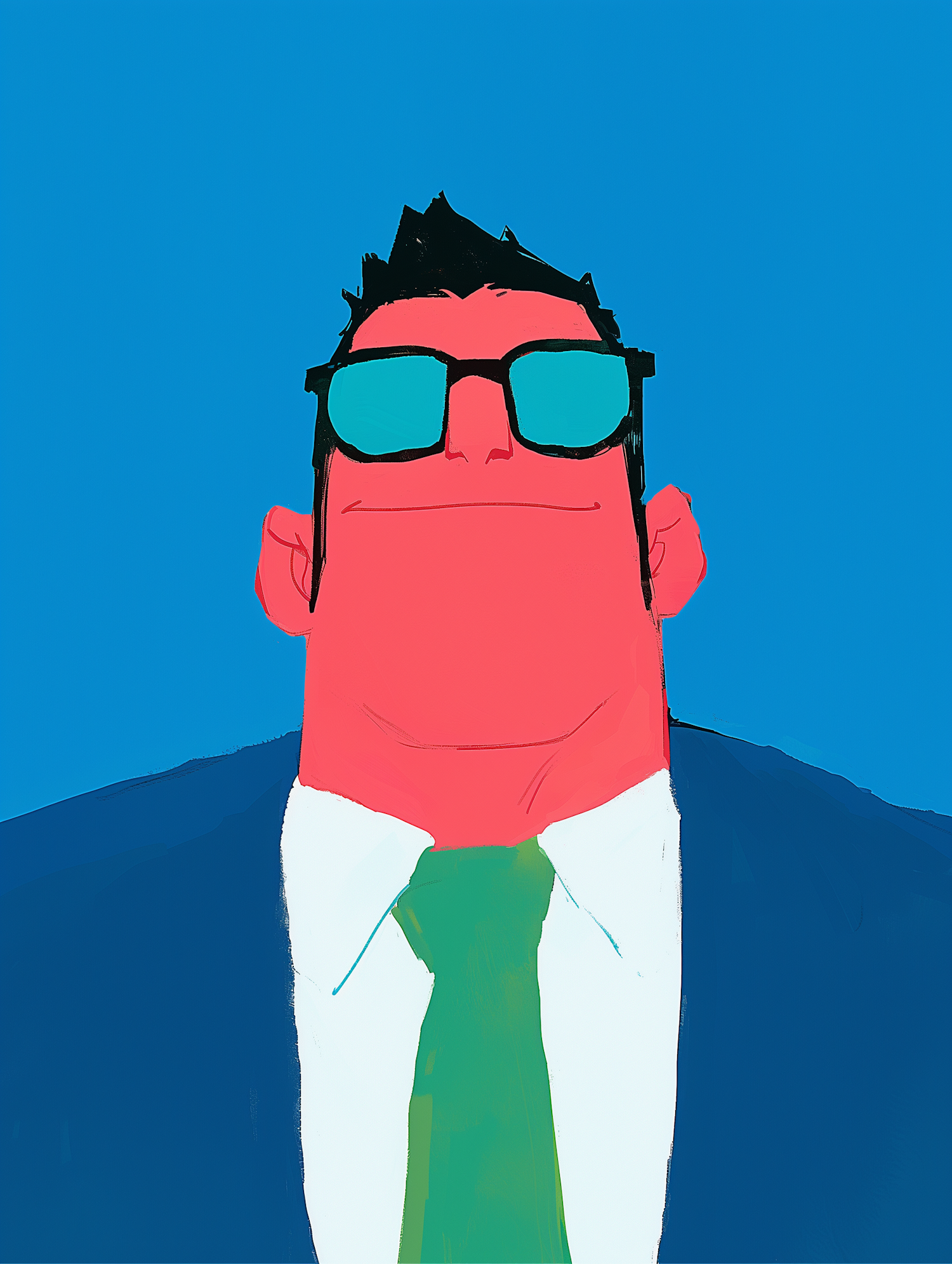 Bold illustration of a confident figure in a suit, green tie, and teal sunglasses against a bright blue background.