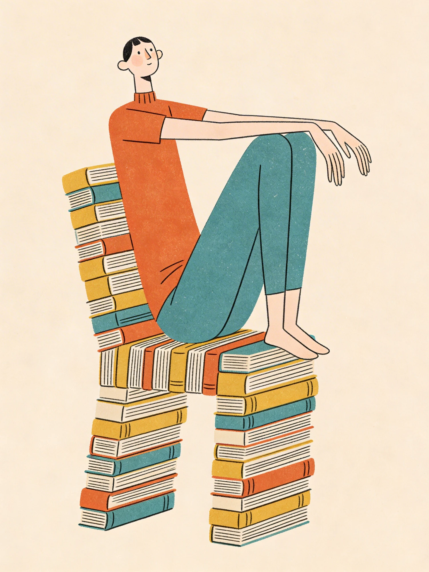 A tall, thin character sitting sitting on a stack of books arranged like a chair, elongated limbs, flat minimal shapes, rough pencil outlines, risograph grain, mid‑century modern colours, playful editorial style.