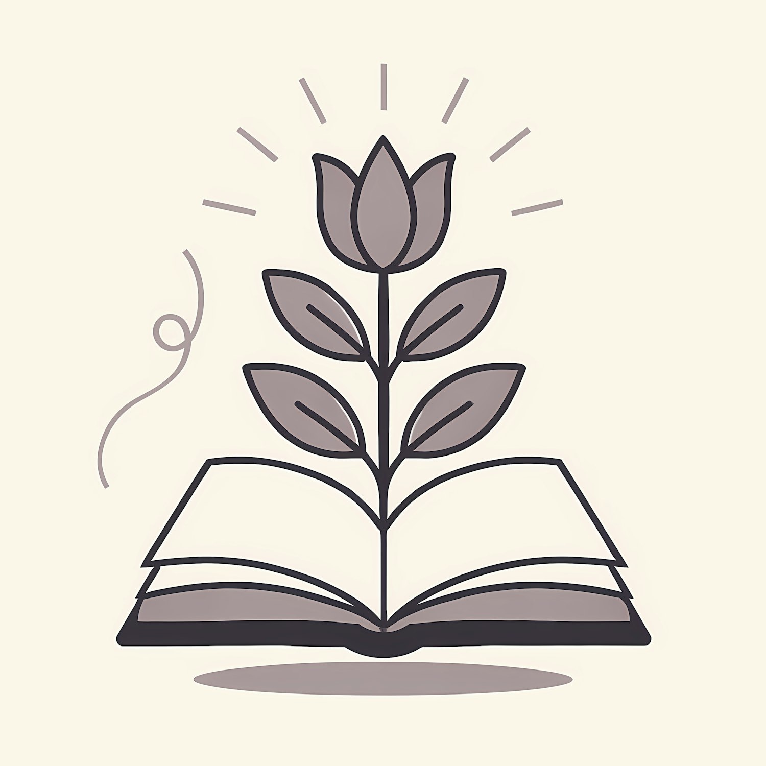 Minimalist illustration of a book with a blooming plant symbolizing growth and knowledge, set against a soft beige background.