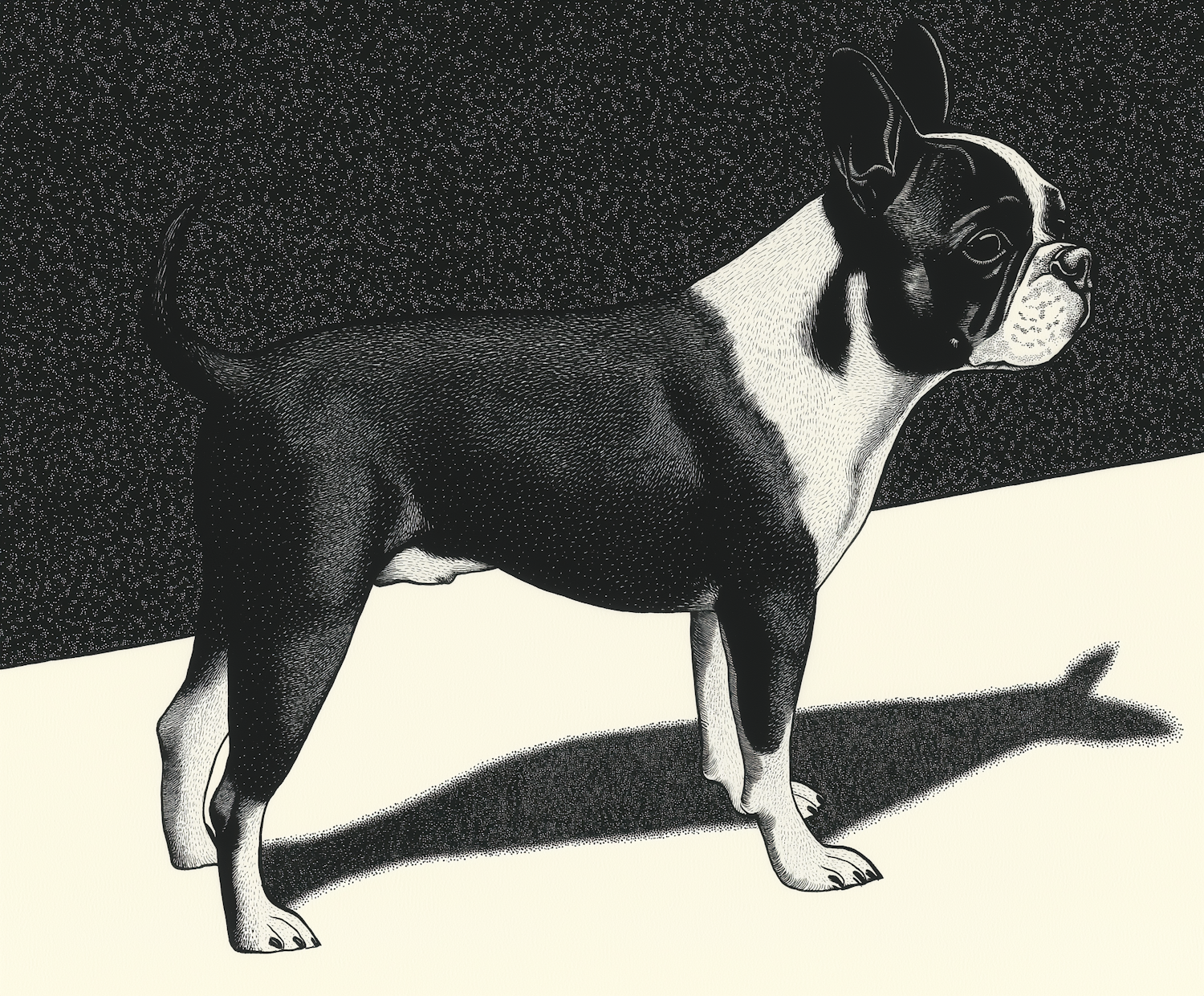 Detailed black and white illustration of a Boston Terrier standing on a light surface with a textured dark background.