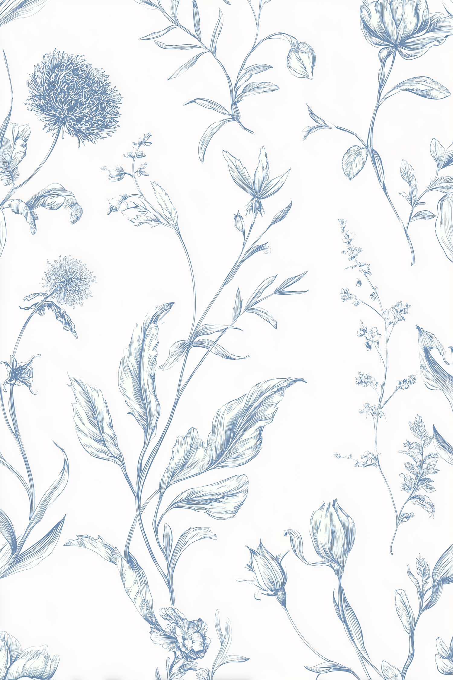 Elegant blue botanical illustration with detailed flowers and leaves on a white background, perfect for decor or design projects.