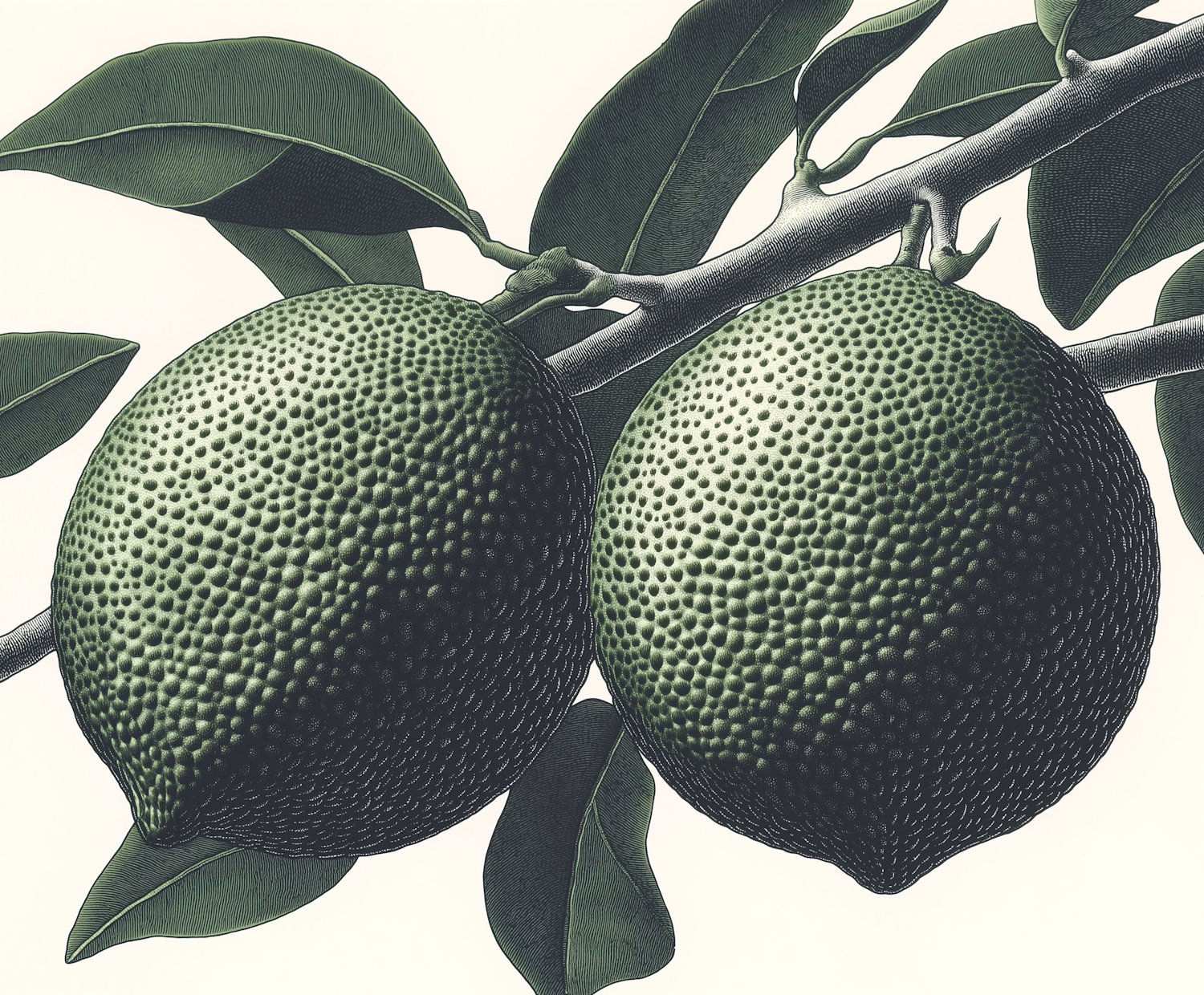 Detailed illustration of two green limes on a branch with lush leaves, showcasing intricate textures and vibrant colors.