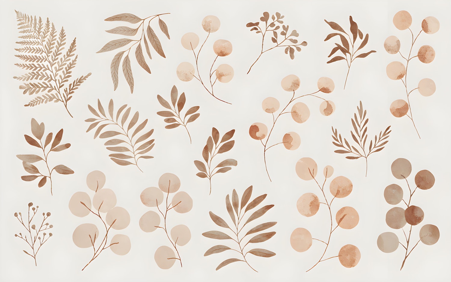 Elegant botanical illustrations with earthy tones of brown and beige, featuring diverse leaves and branches on a light background.