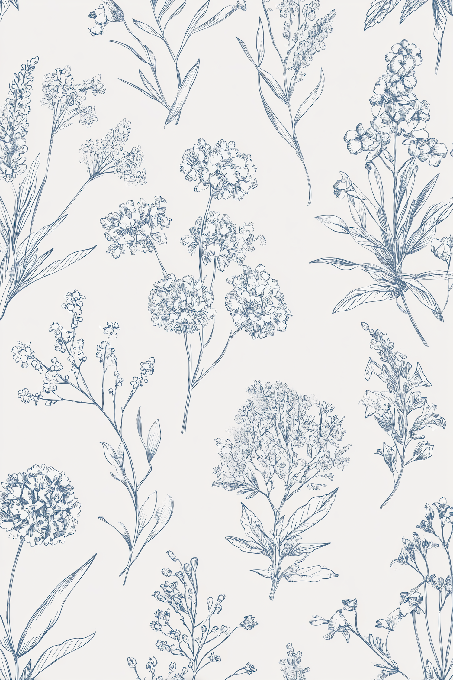Elegant blue botanical illustrations on a white background, perfect for wallpaper or fabric with a natural and artistic touch.