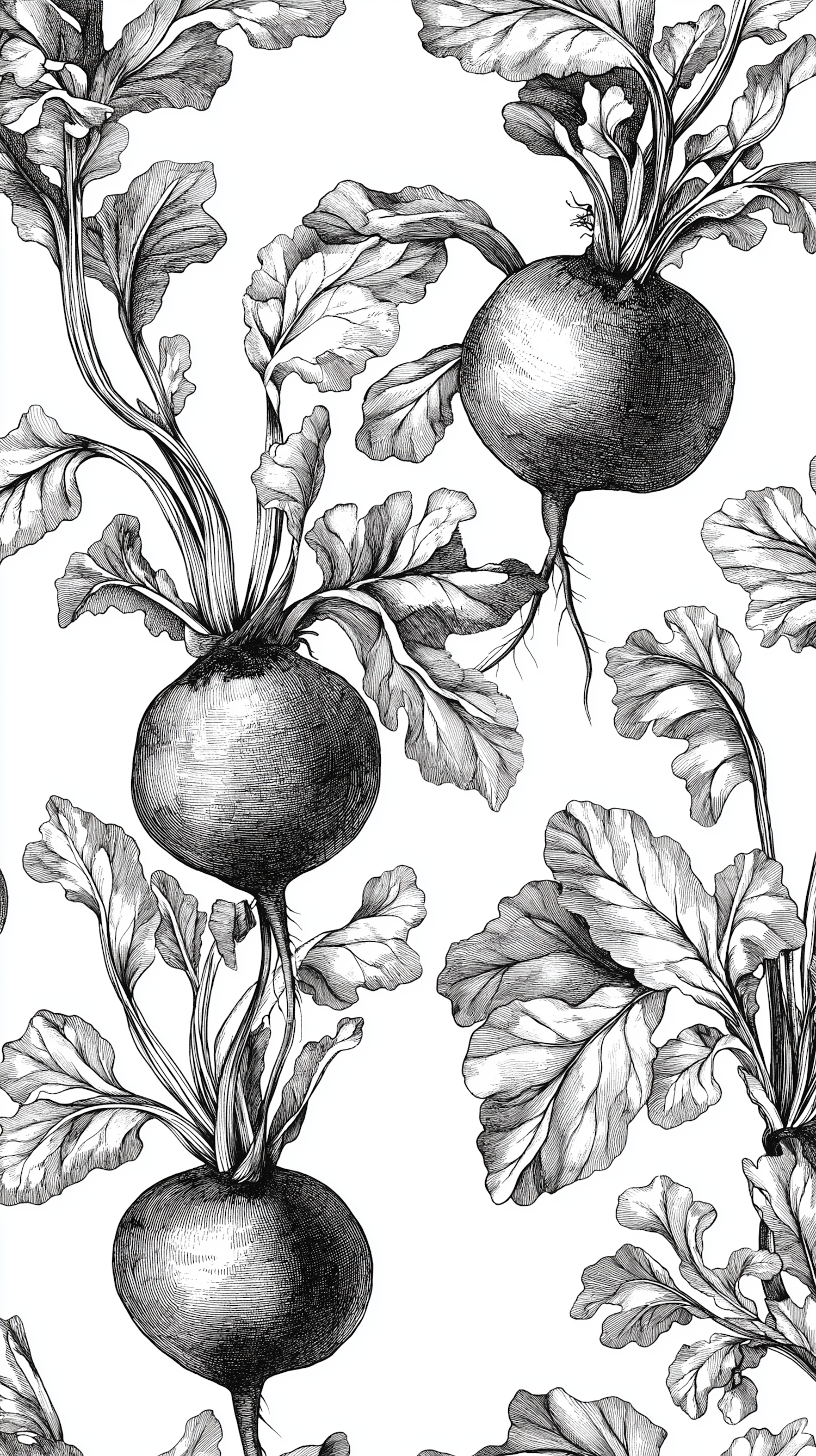 Intricate black and white illustration of beetroots with detailed leaves, showcasing botanical artistry and texture.
