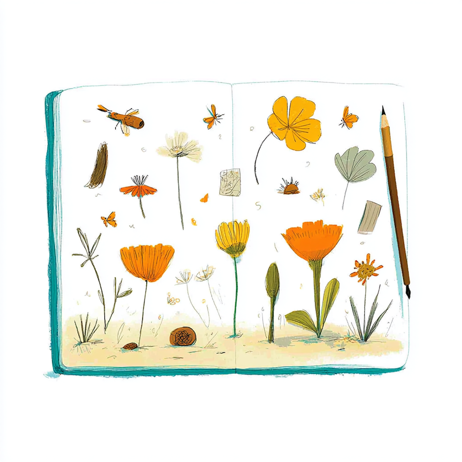 A charming illustration of a sketchbook with vibrant botanical drawings, insects, and a pencil, showcasing creativity and nature's beauty.