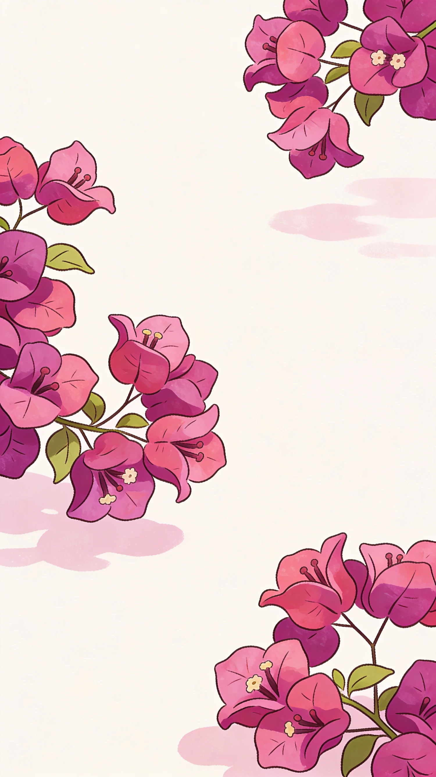A beautiful illustration of pink and purple bougainvillea flowers with green leaves on a soft beige background.