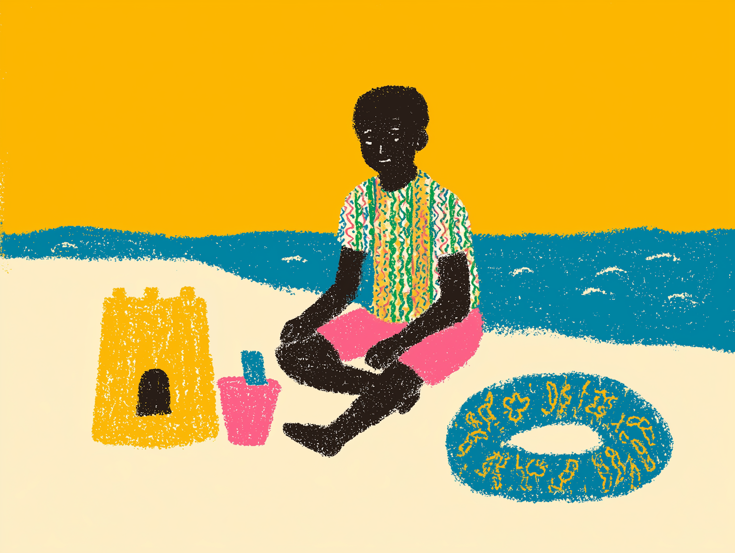 Illustration of a boy on a beach with a sandcastle, bucket, and inflatable ring, set against a vibrant yellow sky and blue ocean.