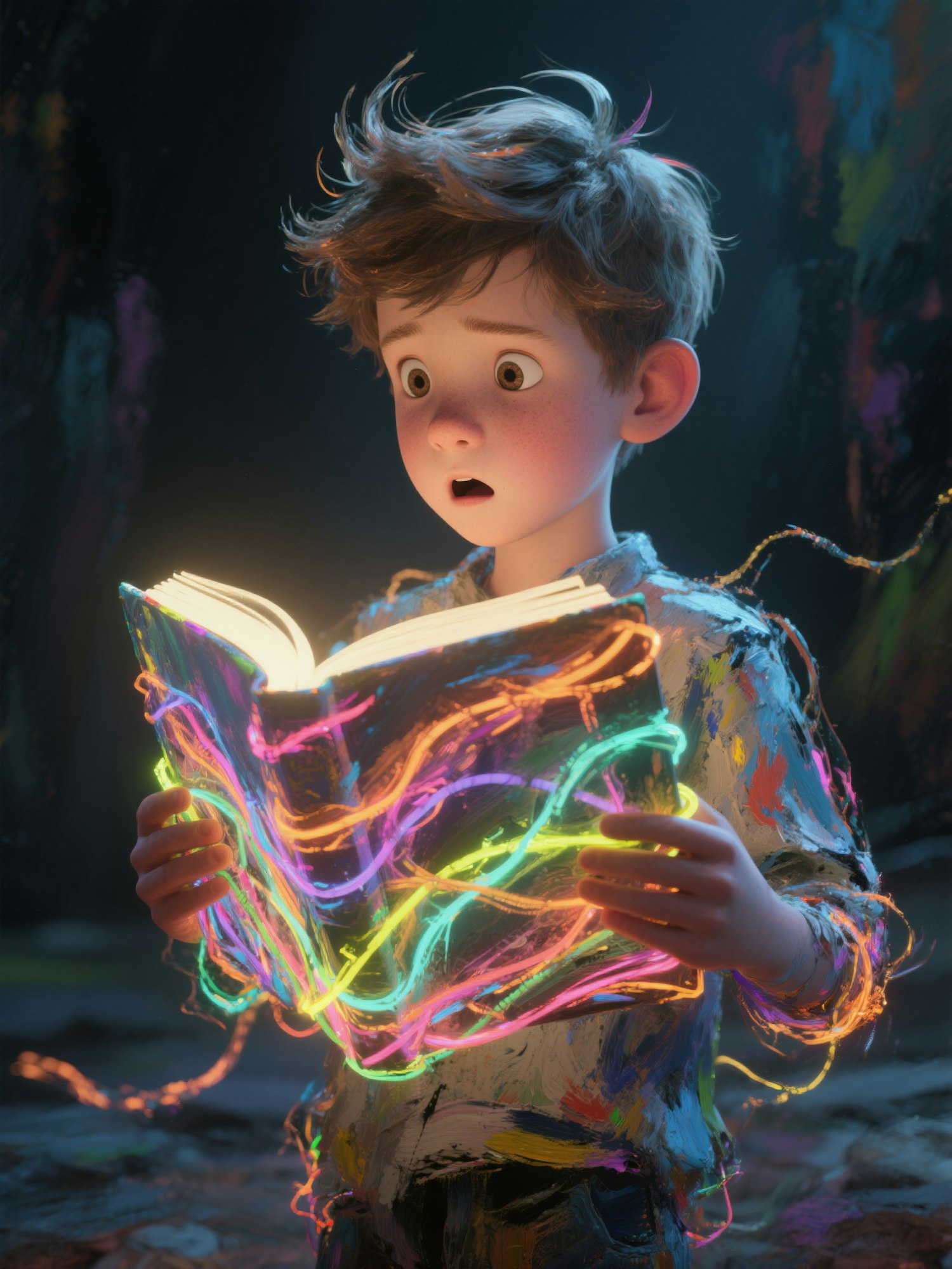 A young boy gazes in awe at a glowing book emitting vibrant neon light trails, set against a dark, artistic background.