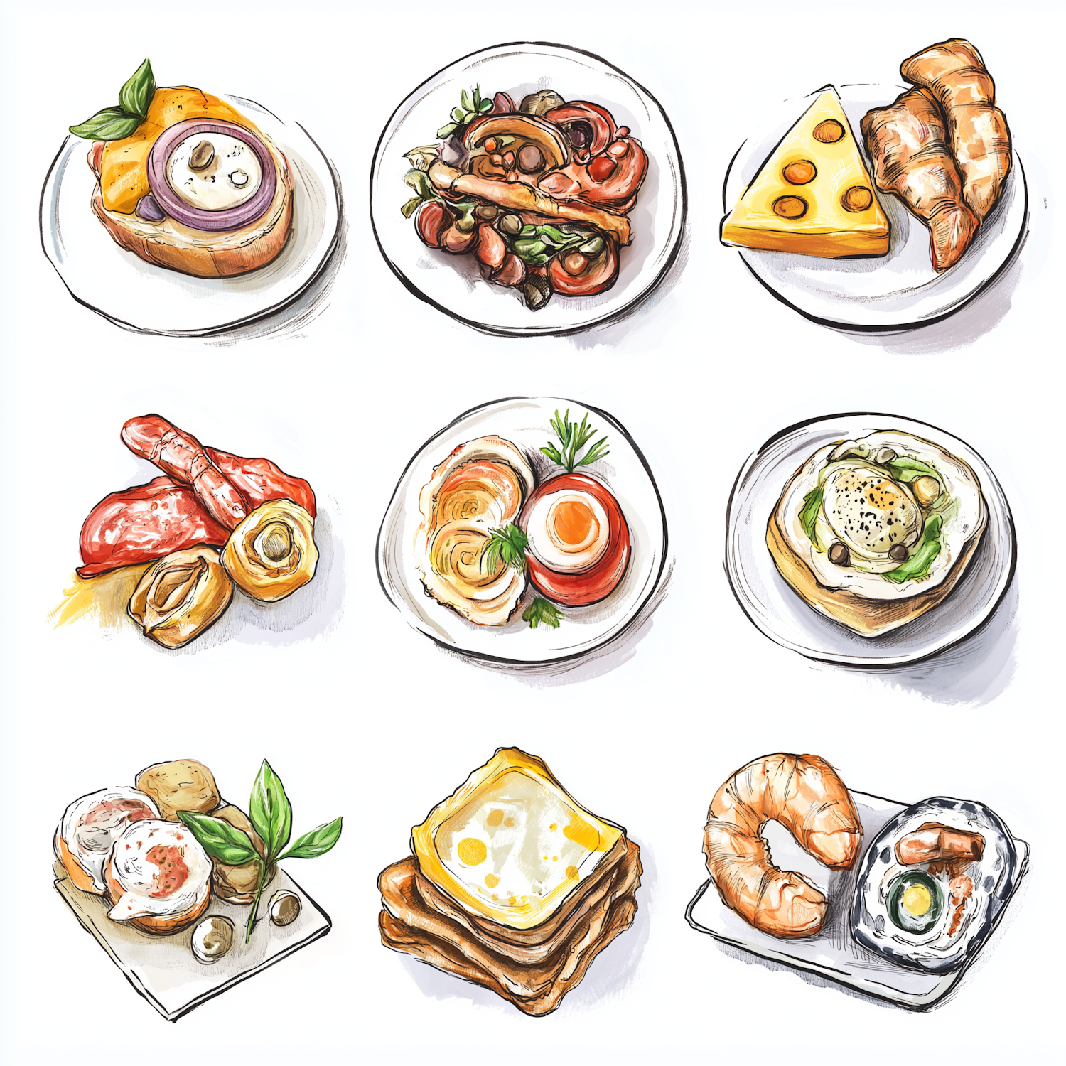 Illustrated breakfast spread with croissants, avocado toast, eggs, seafood, and more, arranged in a colorful 3x3 grid.