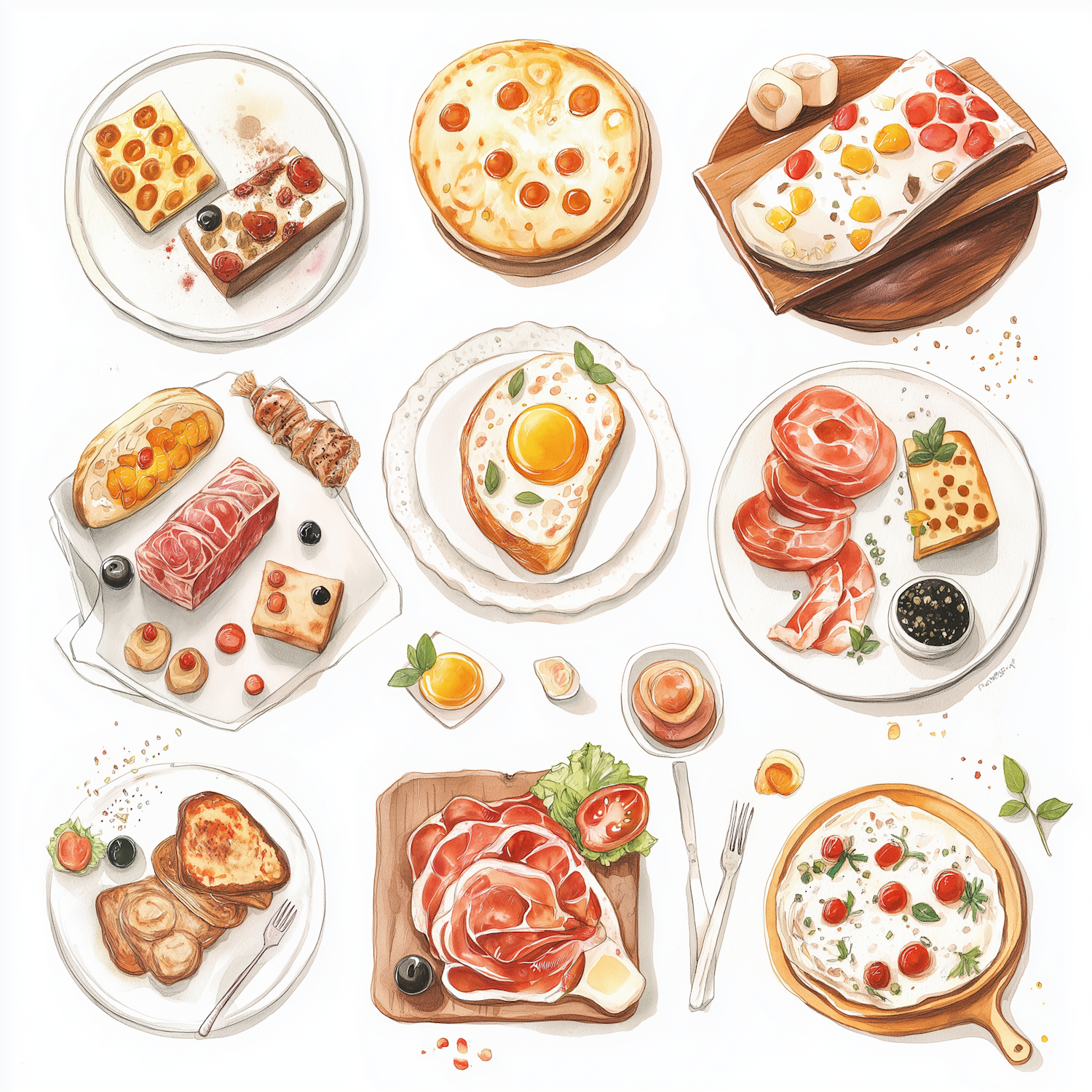 Illustrated breakfast spread with eggs, cured meats, cheese, focaccia, and pastries, all beautifully arranged in a grid layout.