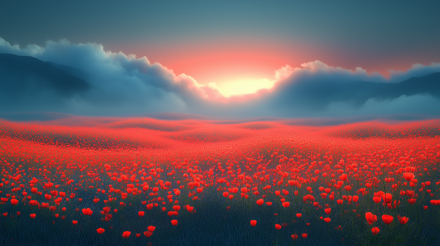 A dreamy field of red poppies under a glowing sunrise, with misty hills and vibrant colors creating a serene, ethereal landscape.