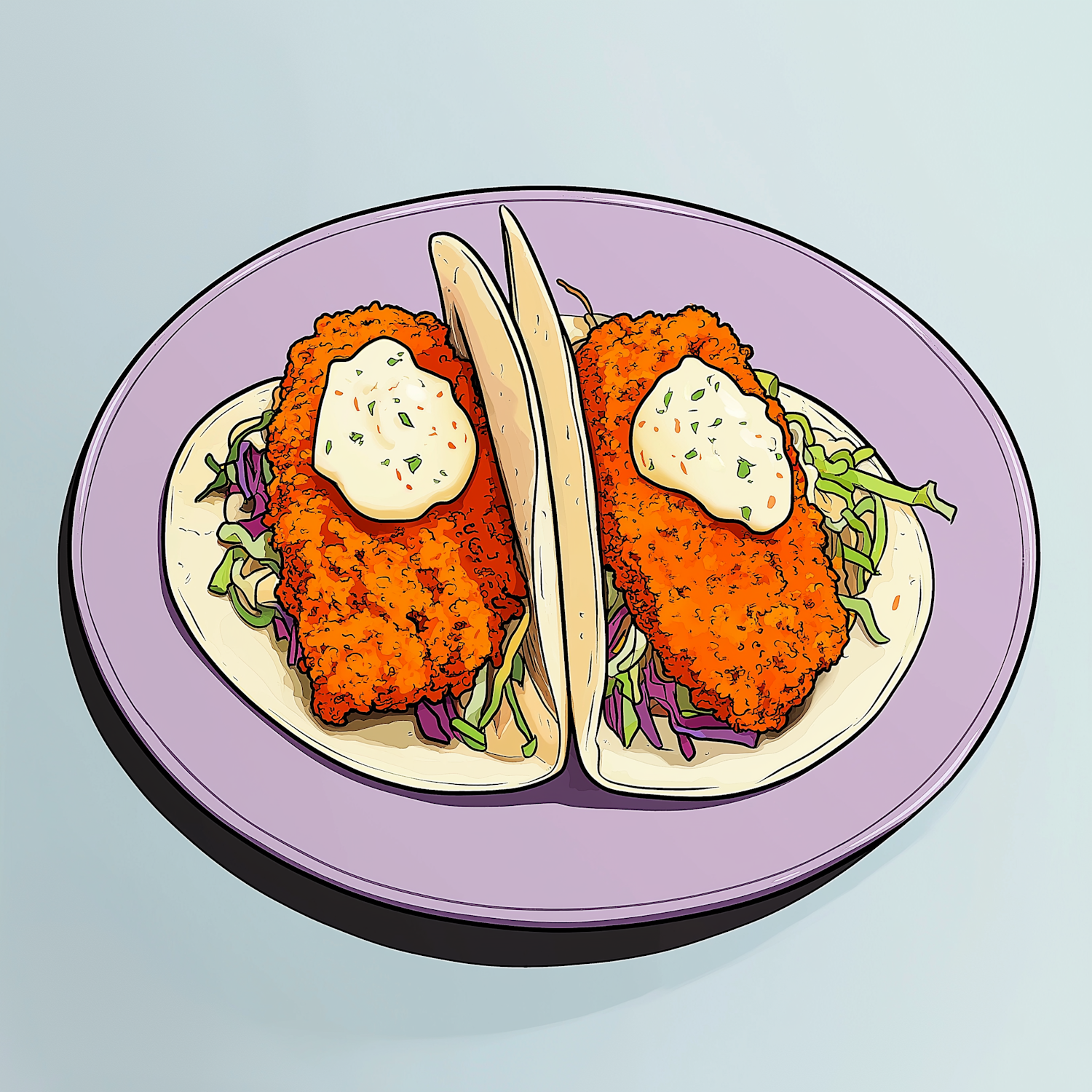Illustration of two crispy fish tacos with creamy sauce on a purple plate, featuring colorful cabbage and soft tortillas.
