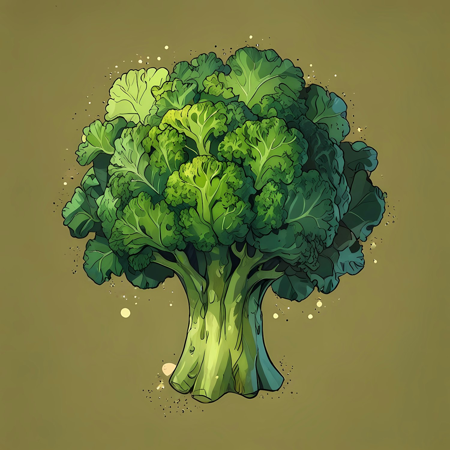 Vibrant illustration of a broccoli head with lush green florets against a muted brown background, highlighting its fresh appearance.