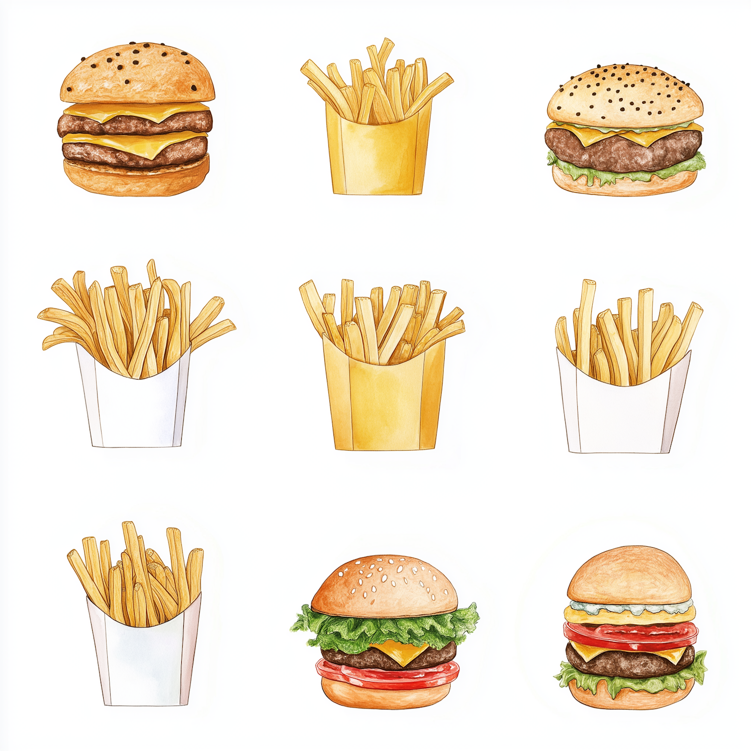 Illustrated grid of burgers and fries with vibrant colors and detailed textures, perfect for food lovers and fast-food enthusiasts.