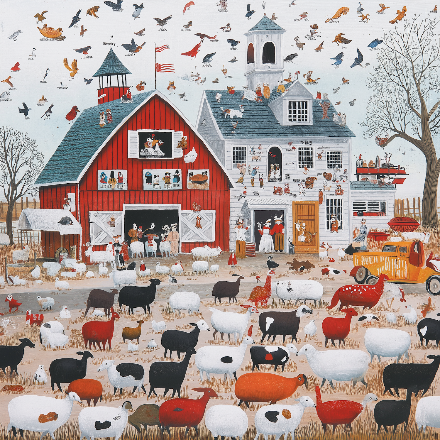 Whimsical farm scene with colorful animals, a red barn, and a lively farmhouse. Birds fill the sky, adding movement and charm.