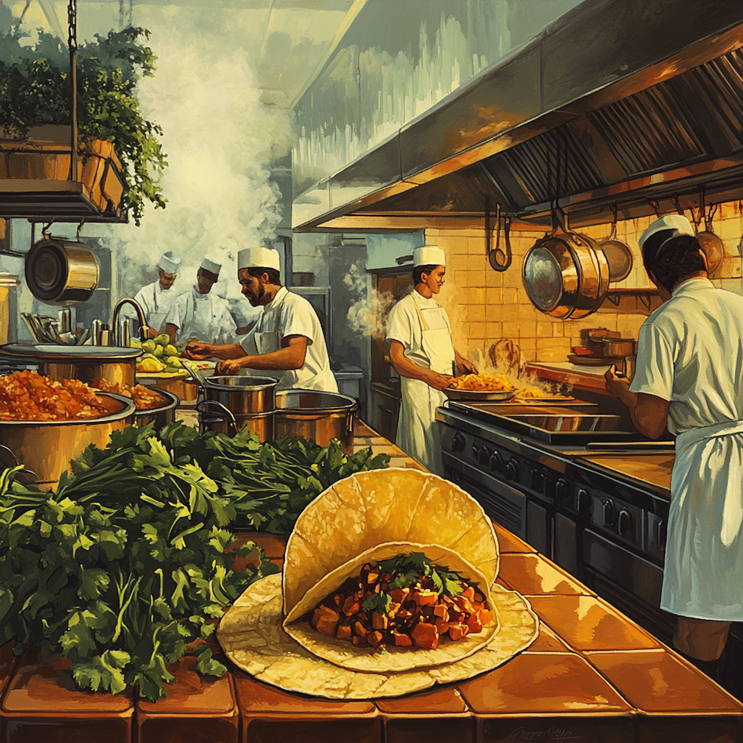 Chefs in a busy kitchen prepare food, with a taco in the foreground surrounded by fresh herbs and vibrant cooking activity in the background.