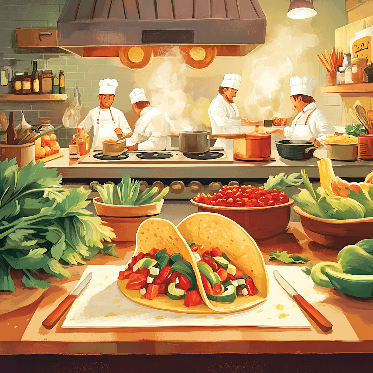 Illustration of chefs cooking in a lively kitchen with fresh vegetables and tacos in the foreground, exuding a warm culinary vibe.