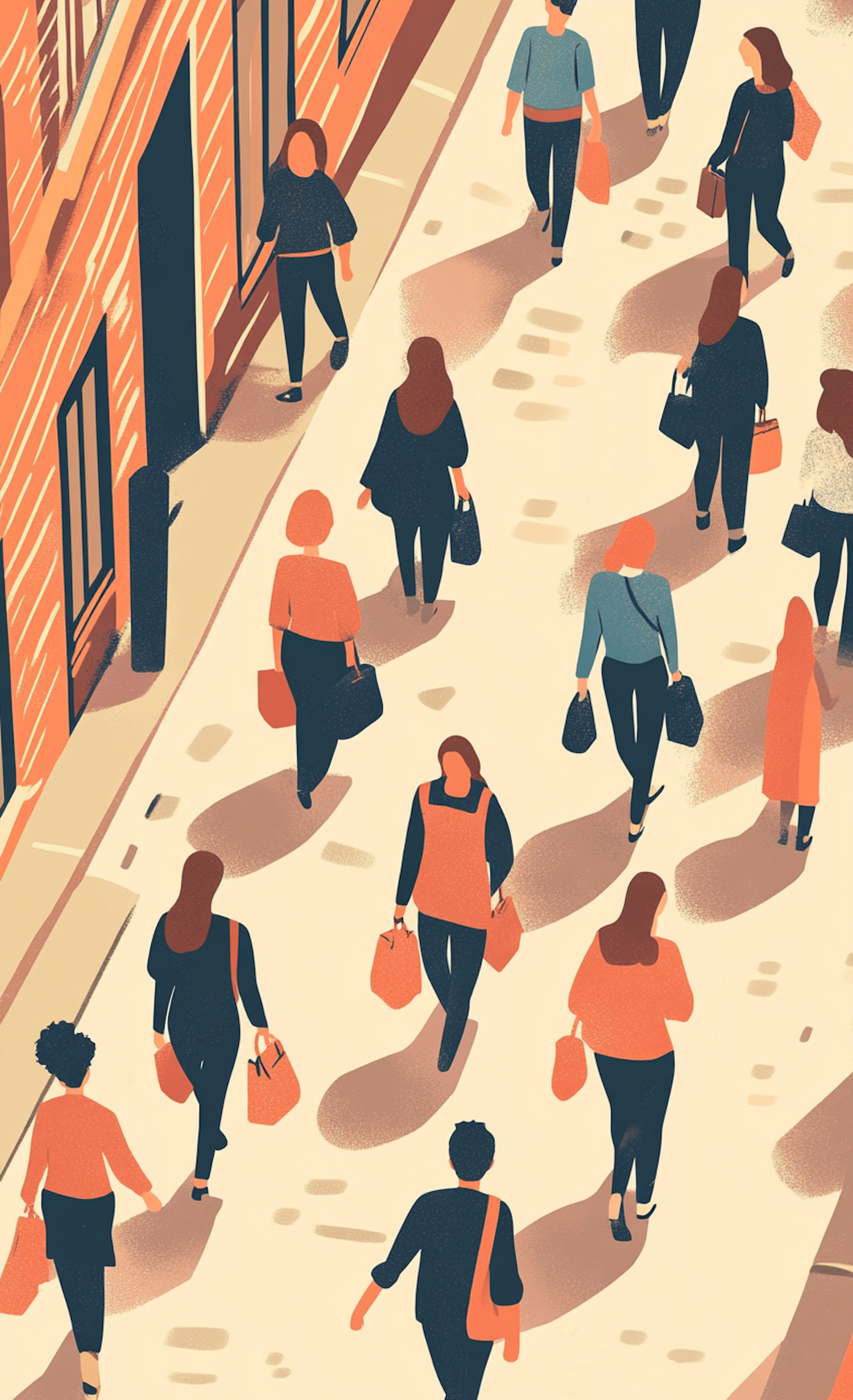 Stylized illustration of a busy street with abstract figures carrying shopping bags, set in warm tones of orange and beige.