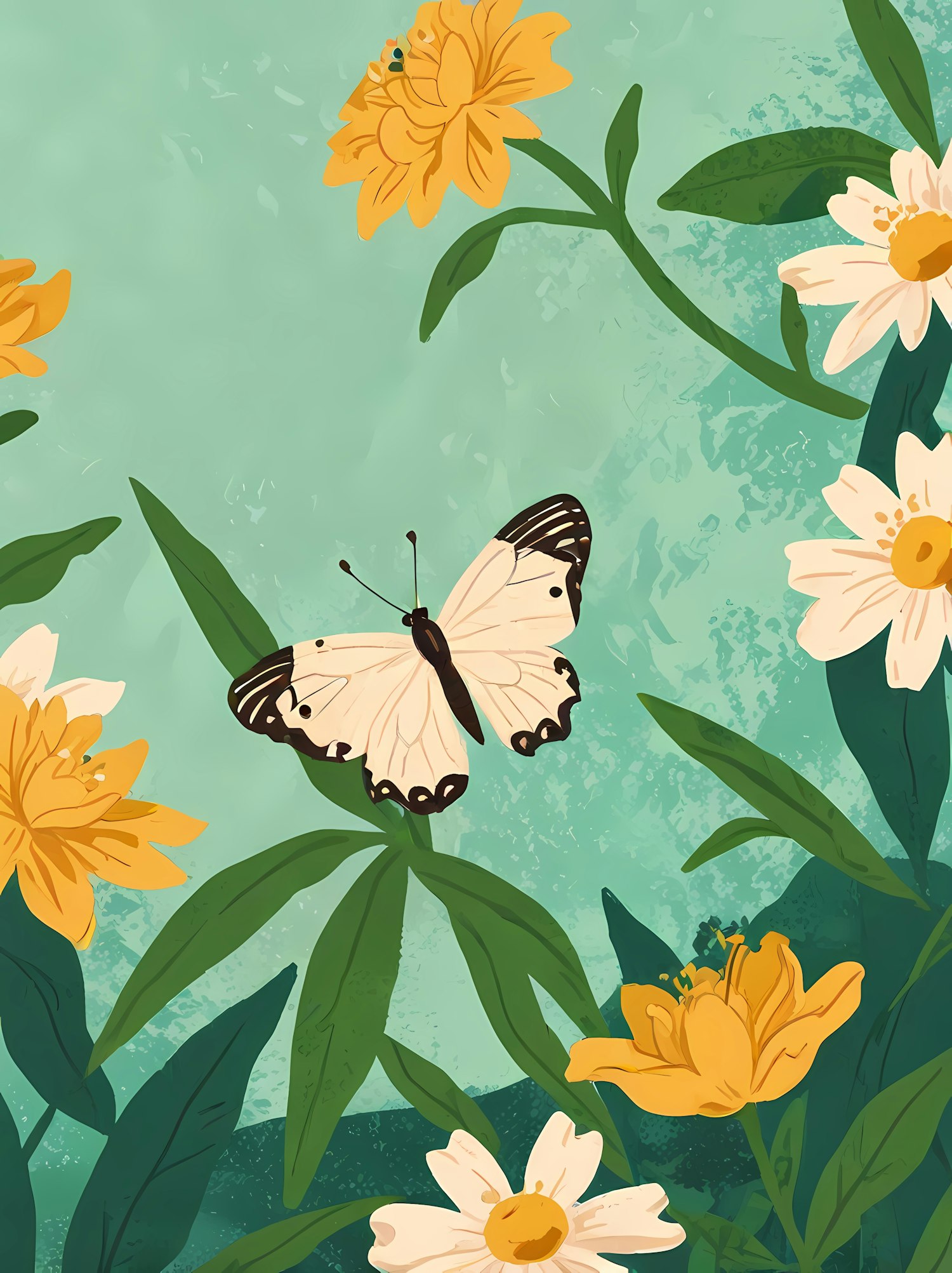 A charming illustration of a butterfly amidst yellow and white flowers, set against a textured teal background with lush green leaves.