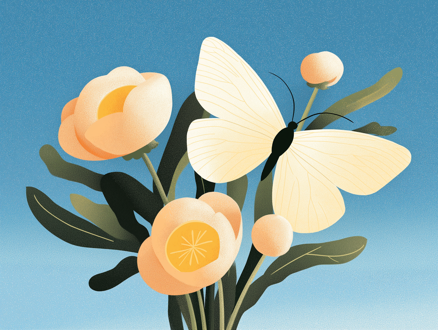 A charming art illustration of a butterfly resting on yellow butterfly ranunculus flowers, rendered in pastel hues and a vivid blue sky. Perfect for tranquil inspiration.