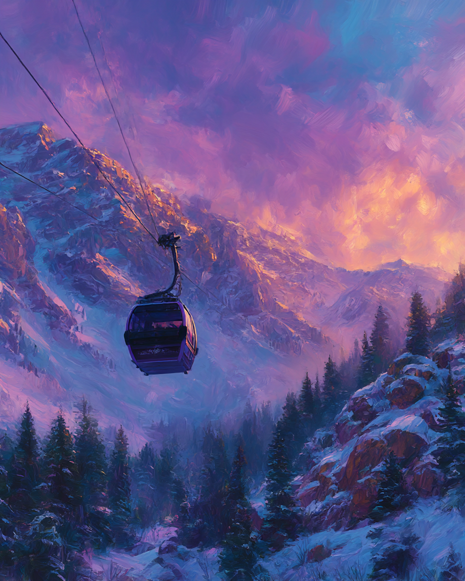 A cable car glides over snowy mountains at sunset, surrounded by vibrant skies and evergreen forests, creating a serene alpine scene.