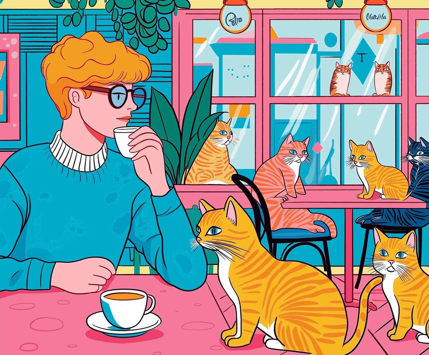 Colorful illustration of a man in a cat café, sipping coffee, surrounded by orange tabby cats in a vibrant, cozy setting.