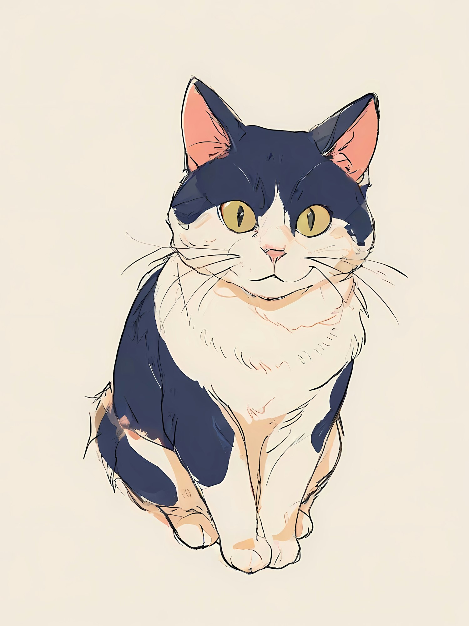 Adorable calico cat illustration with yellow eyes and a soft, sketchy style on a light beige background. Perfect for cat lovers!