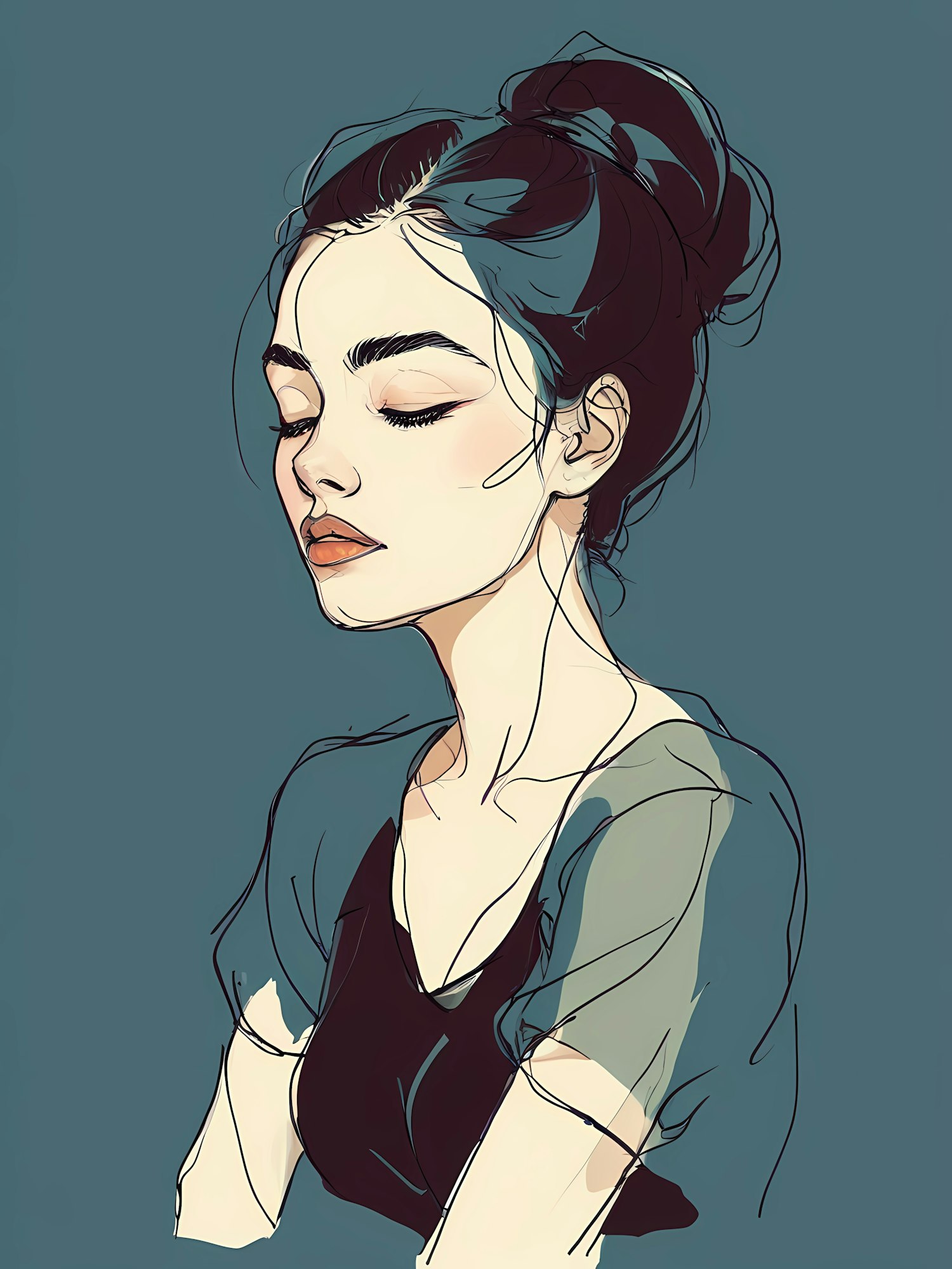 Elegant digital illustration of a serene woman with dark hair in a bun, eyes closed, against a muted teal background.