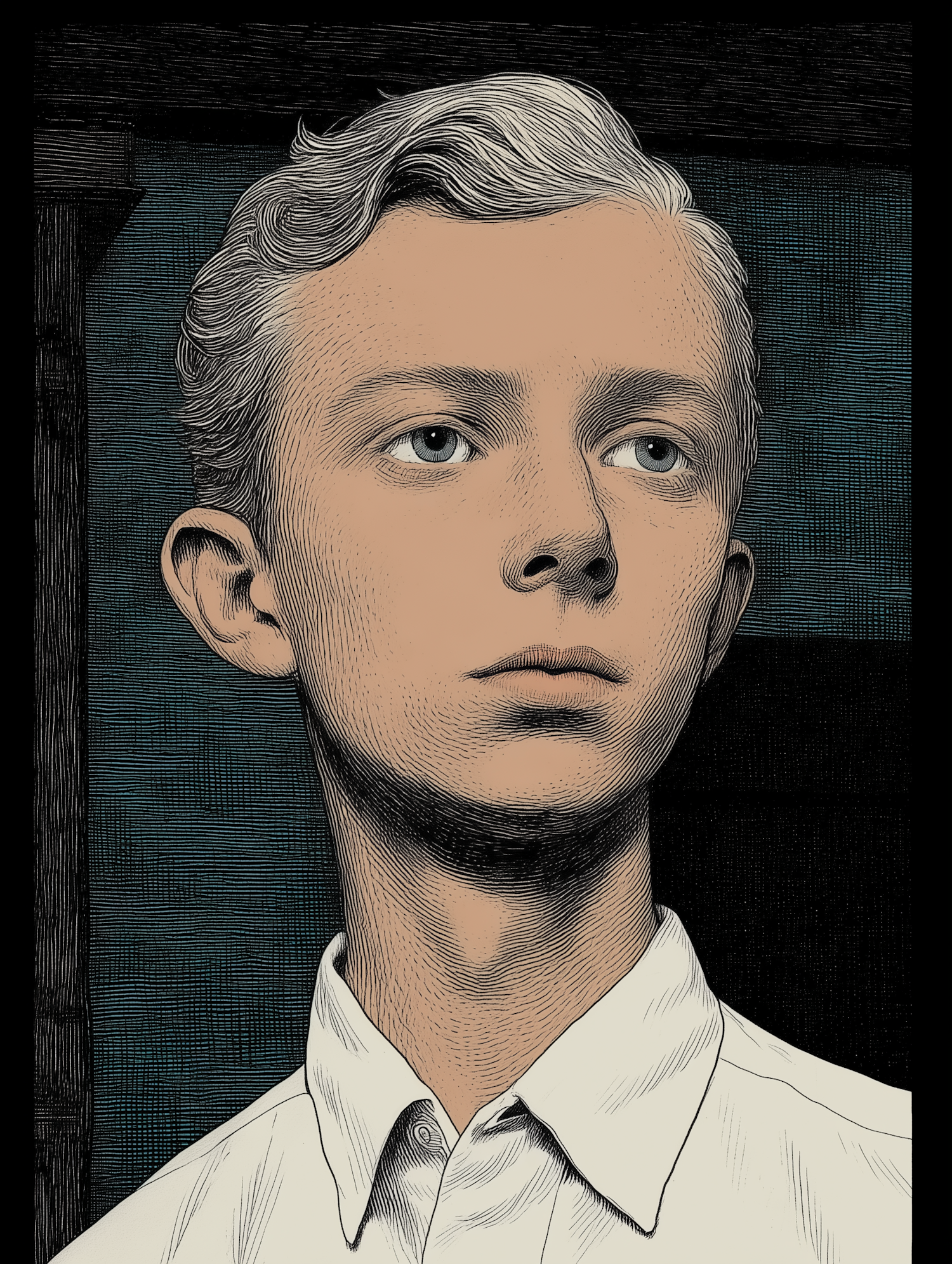 A detailed illustration of a young person with light skin and wavy hair, wearing a white shirt, set against a dark textured background.