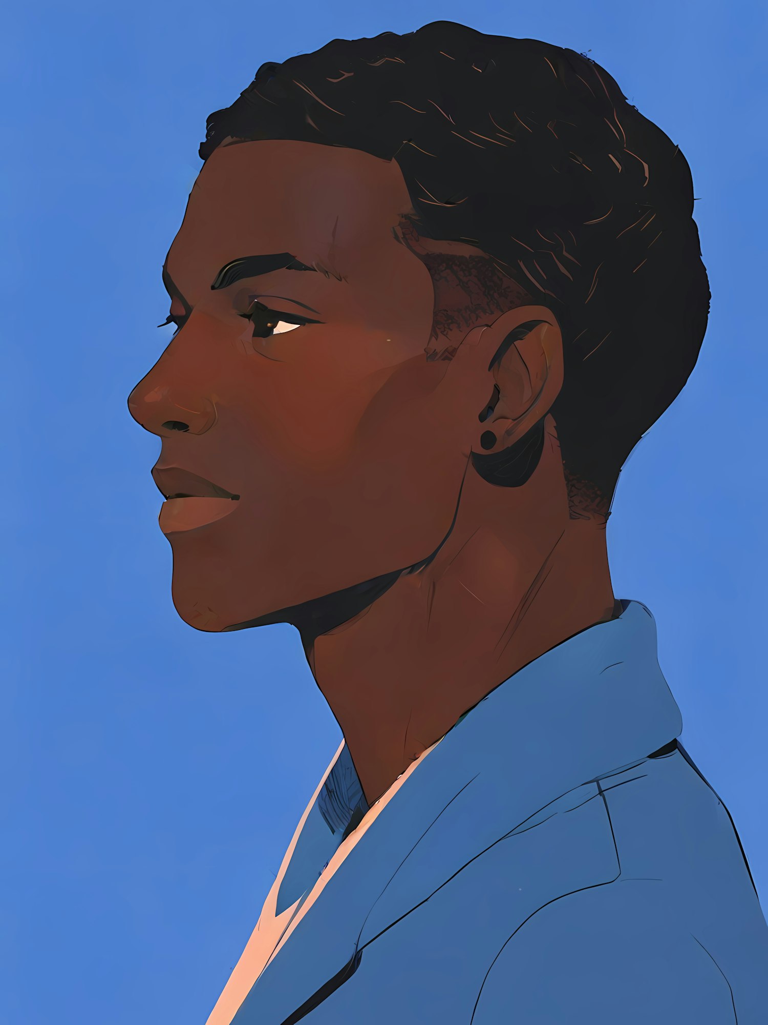 Digital illustration of a young Black man in profile, wearing a blue jacket against a blue background. Calm and contemplative expression.