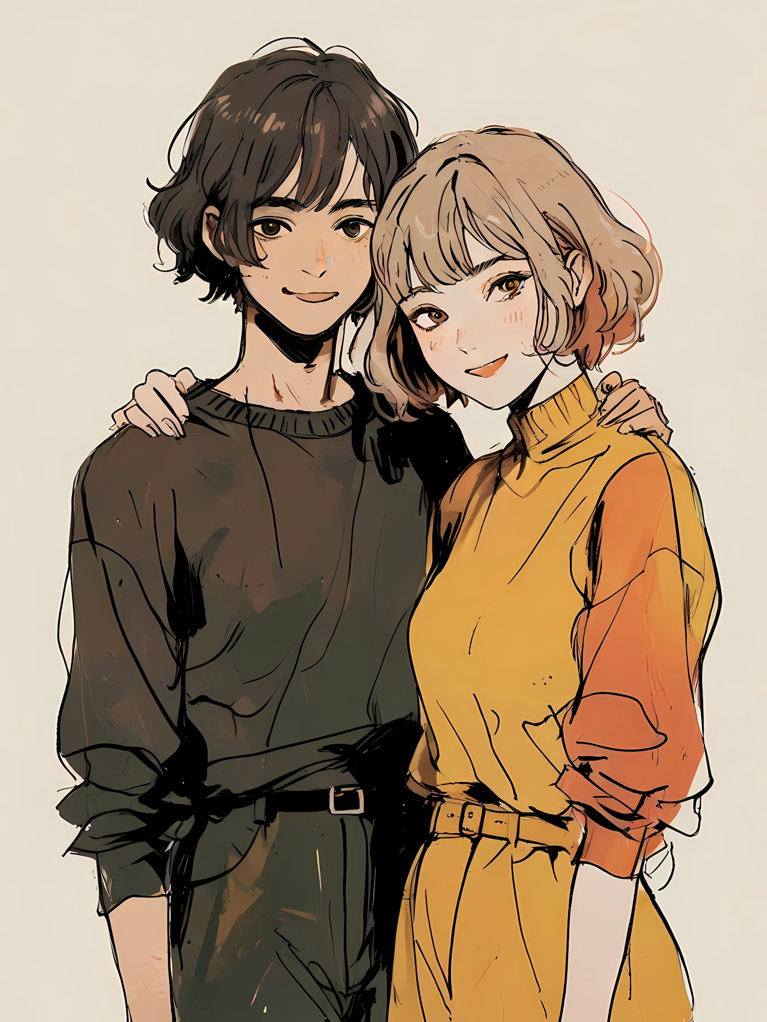 Two animated characters with short hair and warm smiles, dressed in dark and yellow tops, stand closely together, exuding friendship.