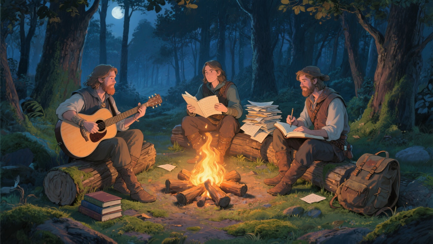 Three friends enjoy a campfire in a moonlit forest, playing guitar, reading, and writing, surrounded by books and nature's tranquility.