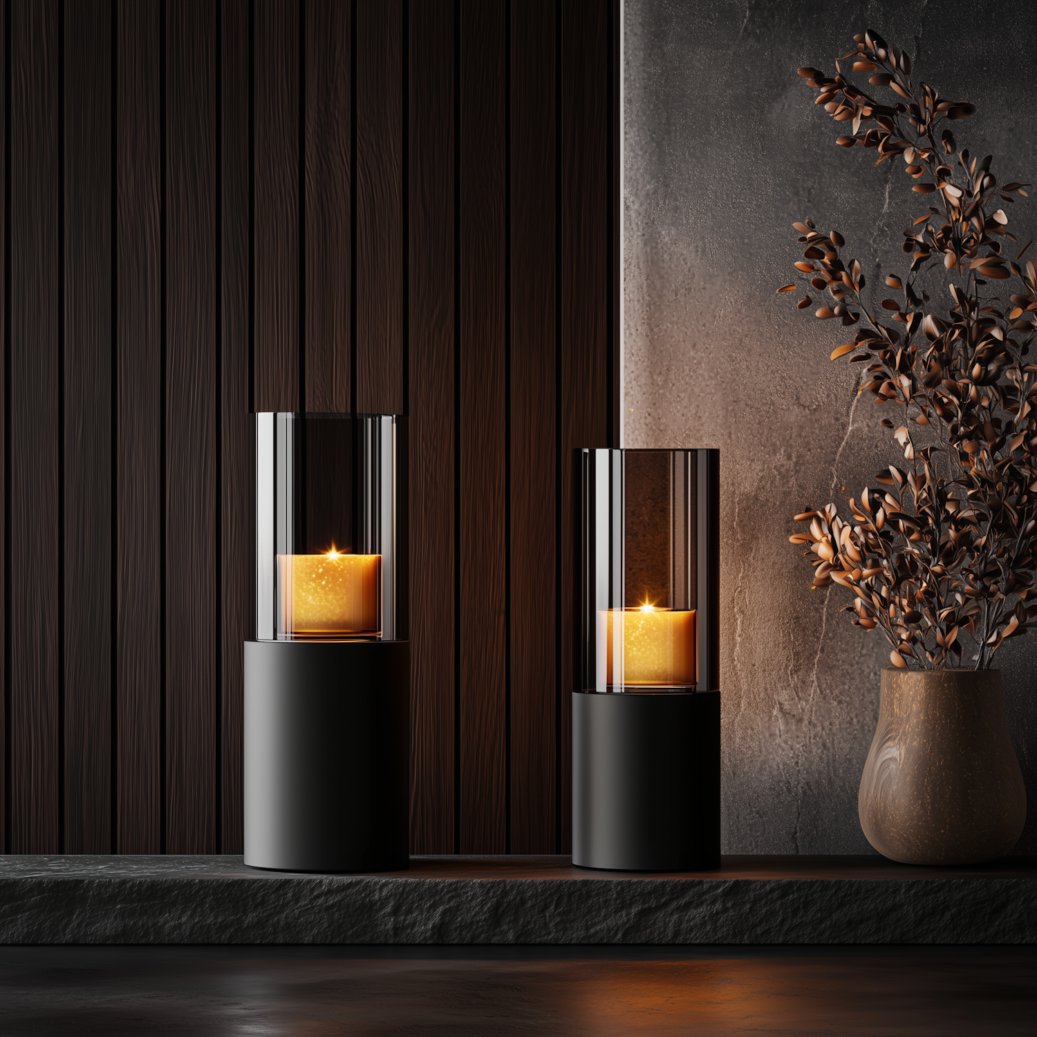 Modern candle decor with warm glow, glass holders, and bronze-toned dried leaves in a vase against wood and stone textures.