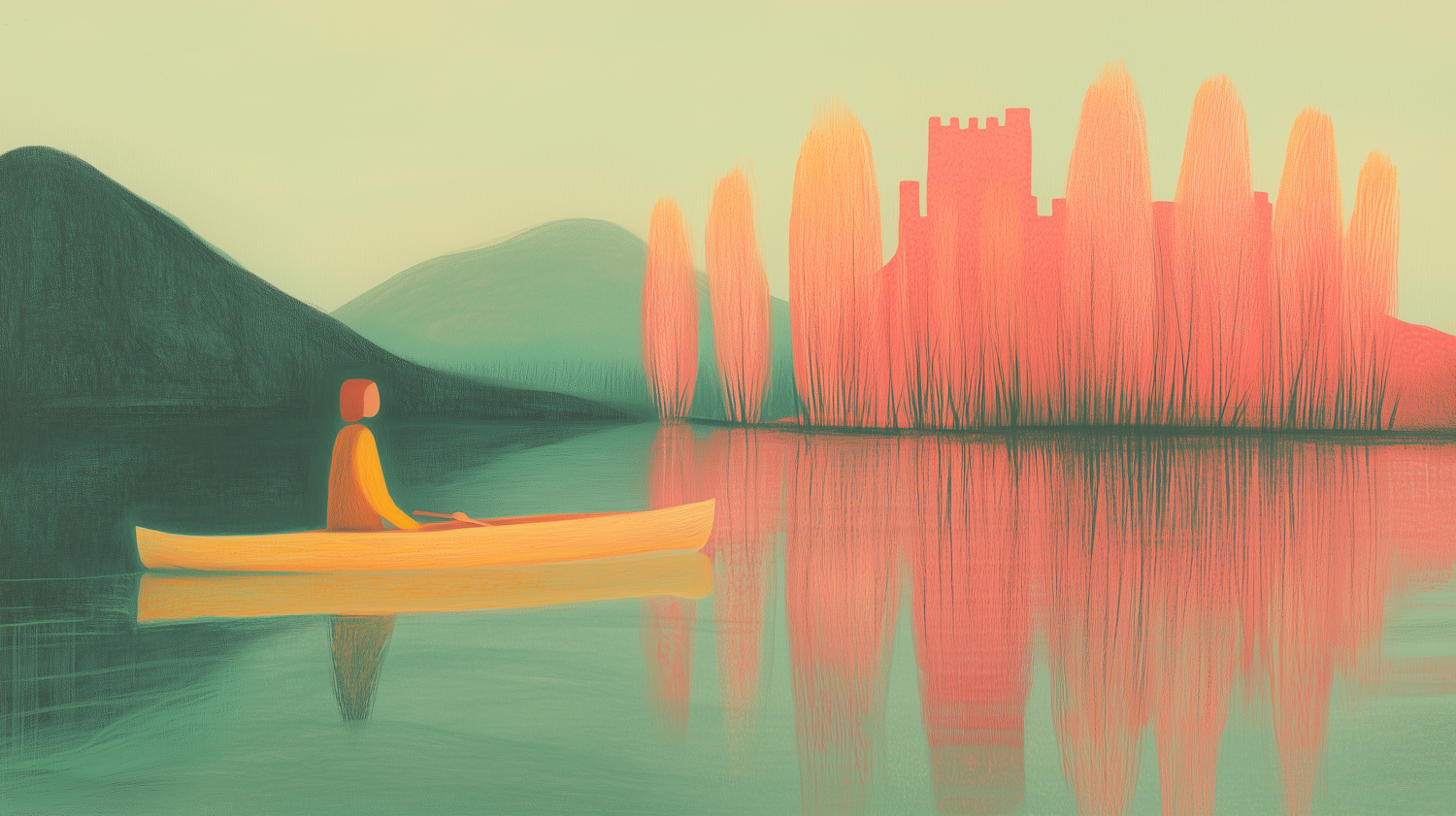 Dreamy illustration of a canoeist on a pastel lake with glowing pink trees and a castle in the background. Perfectly serene and artistic.