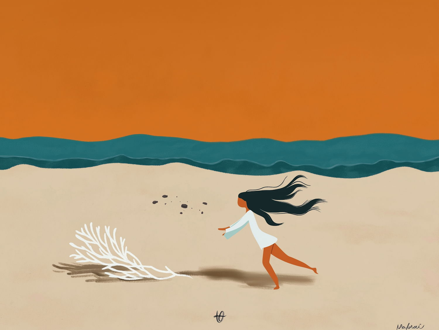 Illustration of a girl running on a beach with a vibrant orange sky and teal ocean, featuring a white coral on the sand.