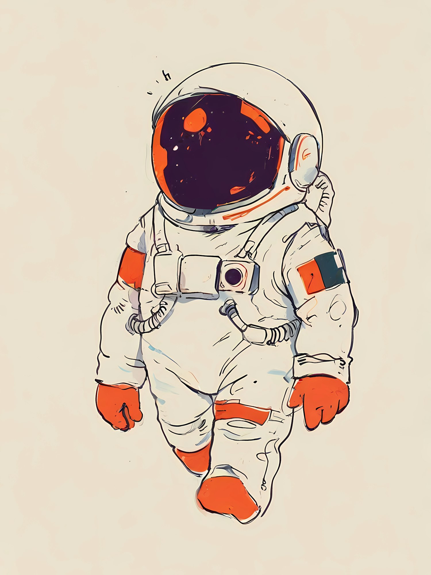 Cartoon astronaut in a white suit with orange accents, set against a beige background. Playful and imaginative space exploration theme.