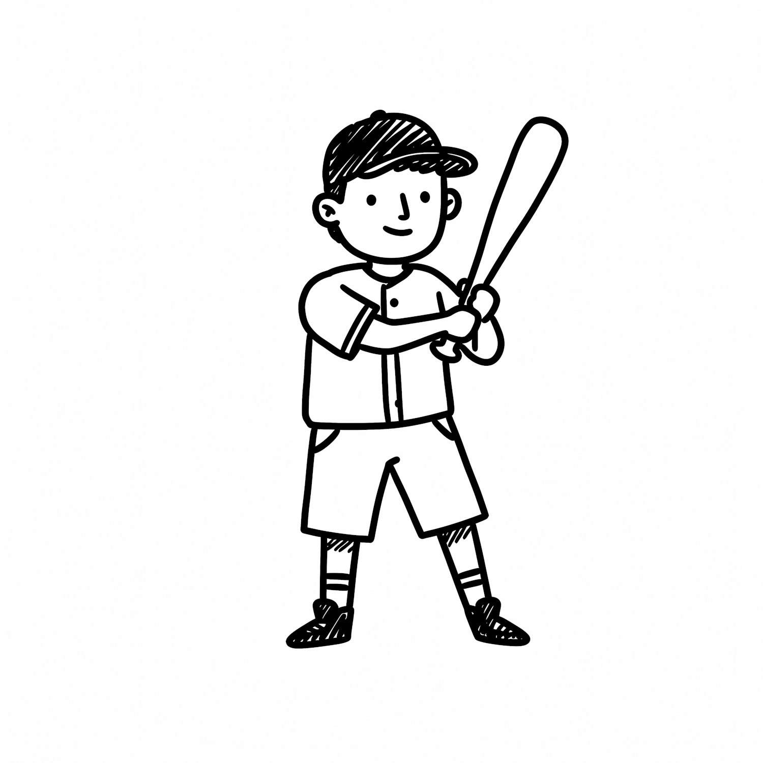 Cartoon illustration of a young baseball player holding a bat, ready to swing, wearing a cap, jersey, and shorts, in a simple black-and-white style.