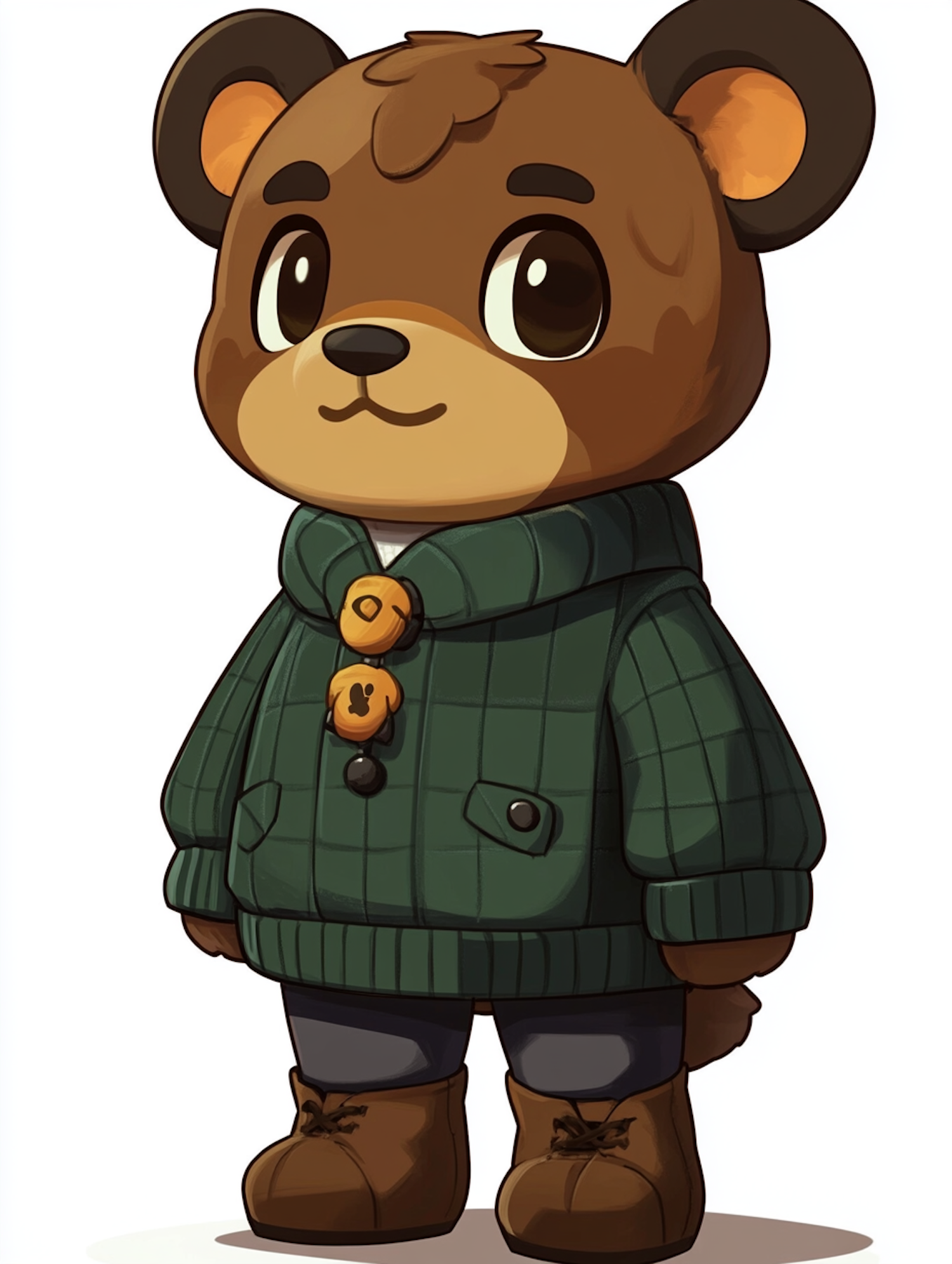 Adorable cartoon bear in a green sweater with acorn buttons, brown boots, and expressive eyes. Perfect for children's illustrations.