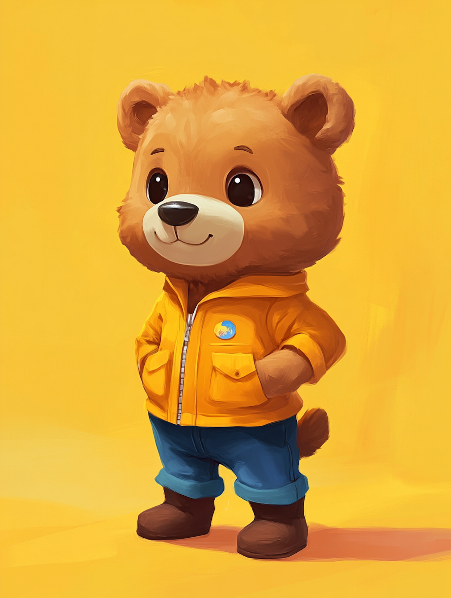 Adorable cartoon bear in a yellow jacket and blue jeans, set against a bright yellow background. Perfect for children's themes.