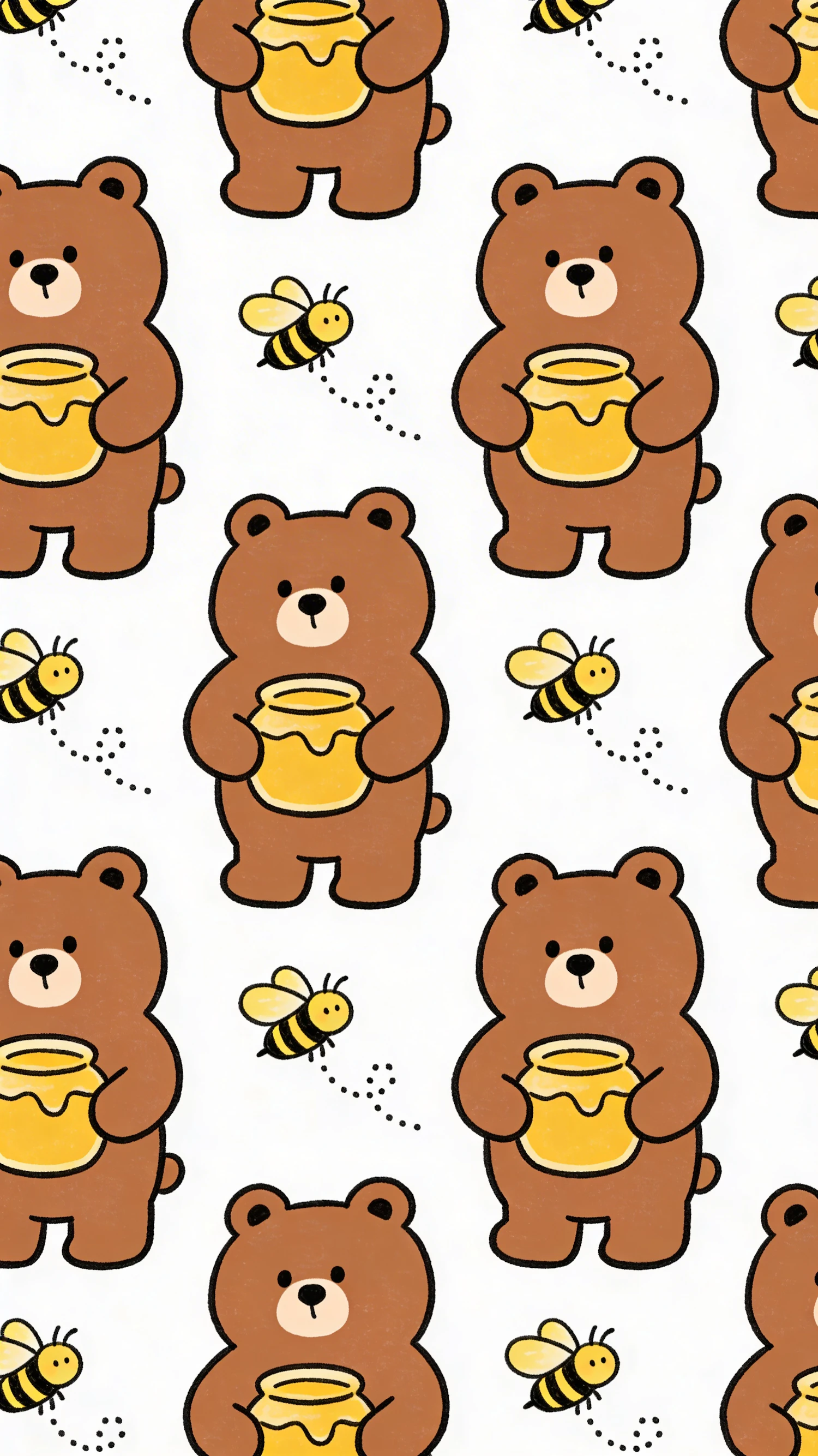 Cute seamless pattern of cartoon bears holding honey jars with buzzing bees on a white background, perfect for kids' designs.