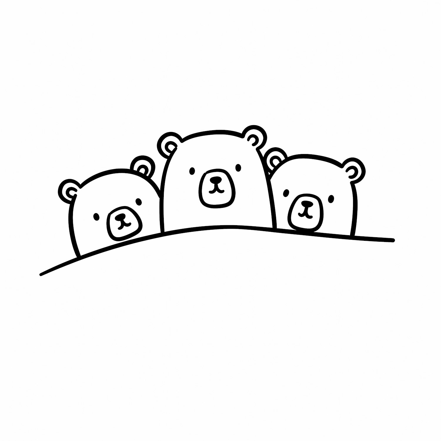 A cute black-and-white illustration of three cartoon bears peeking over a hill, drawn in a minimalistic and playful style.