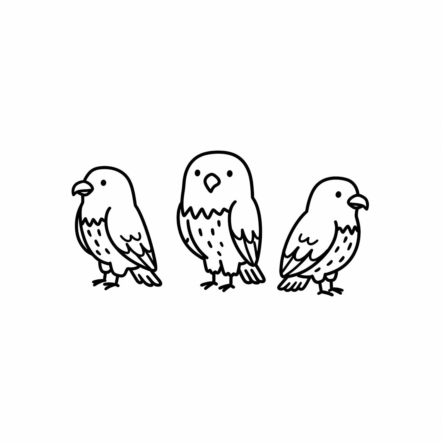 A charming black-and-white line drawing of three cartoon birds in a row, showcasing a simple and clean design.