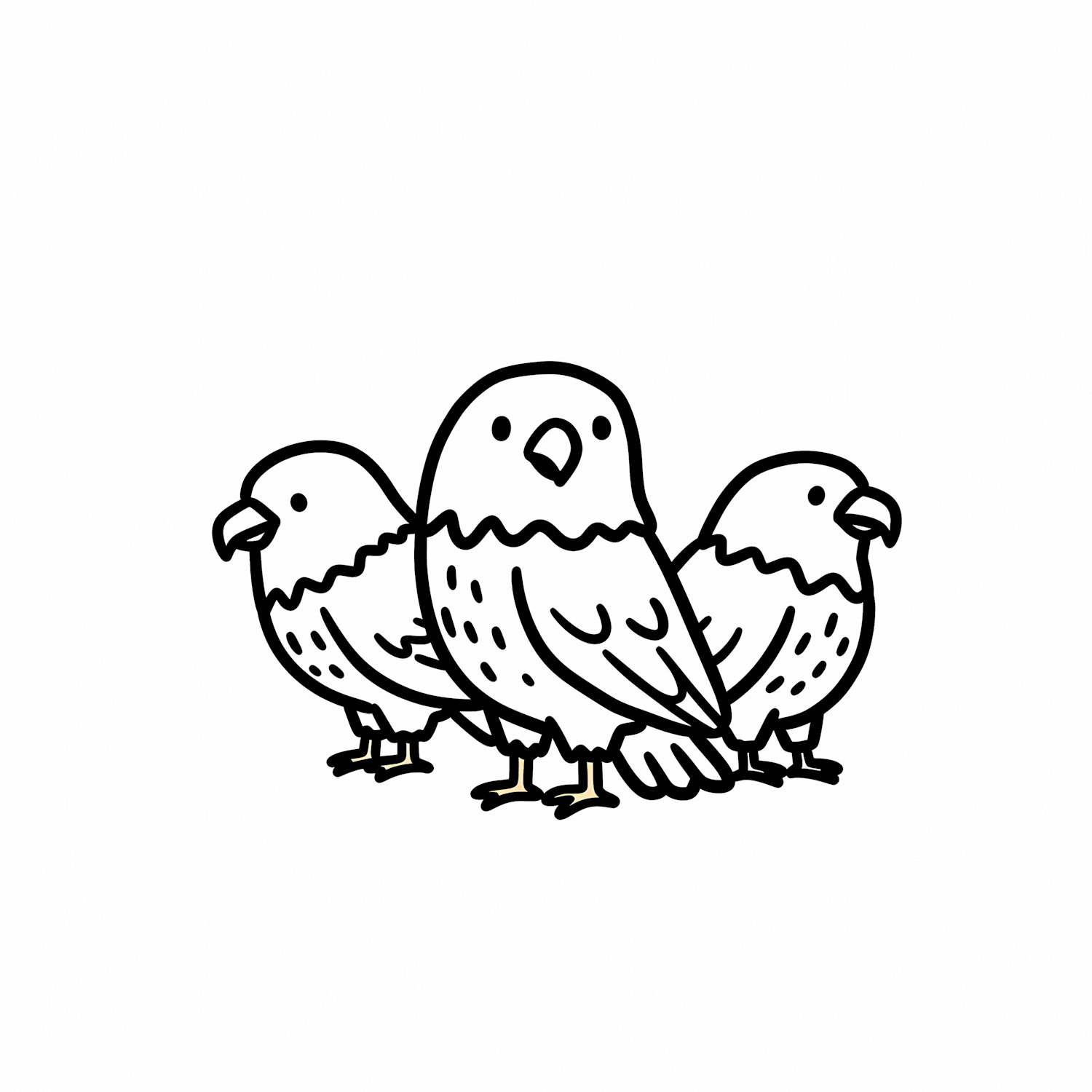 A charming black-and-white cartoon illustration of three birds standing together, perfect for creative projects or educational use.