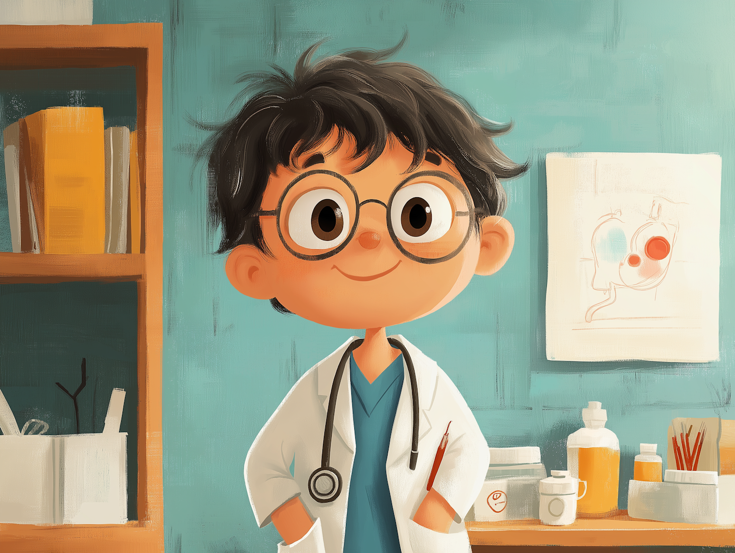 Charming illustration of a young boy in a doctor's coat with a stethoscope, set in a playful medical office environment.
