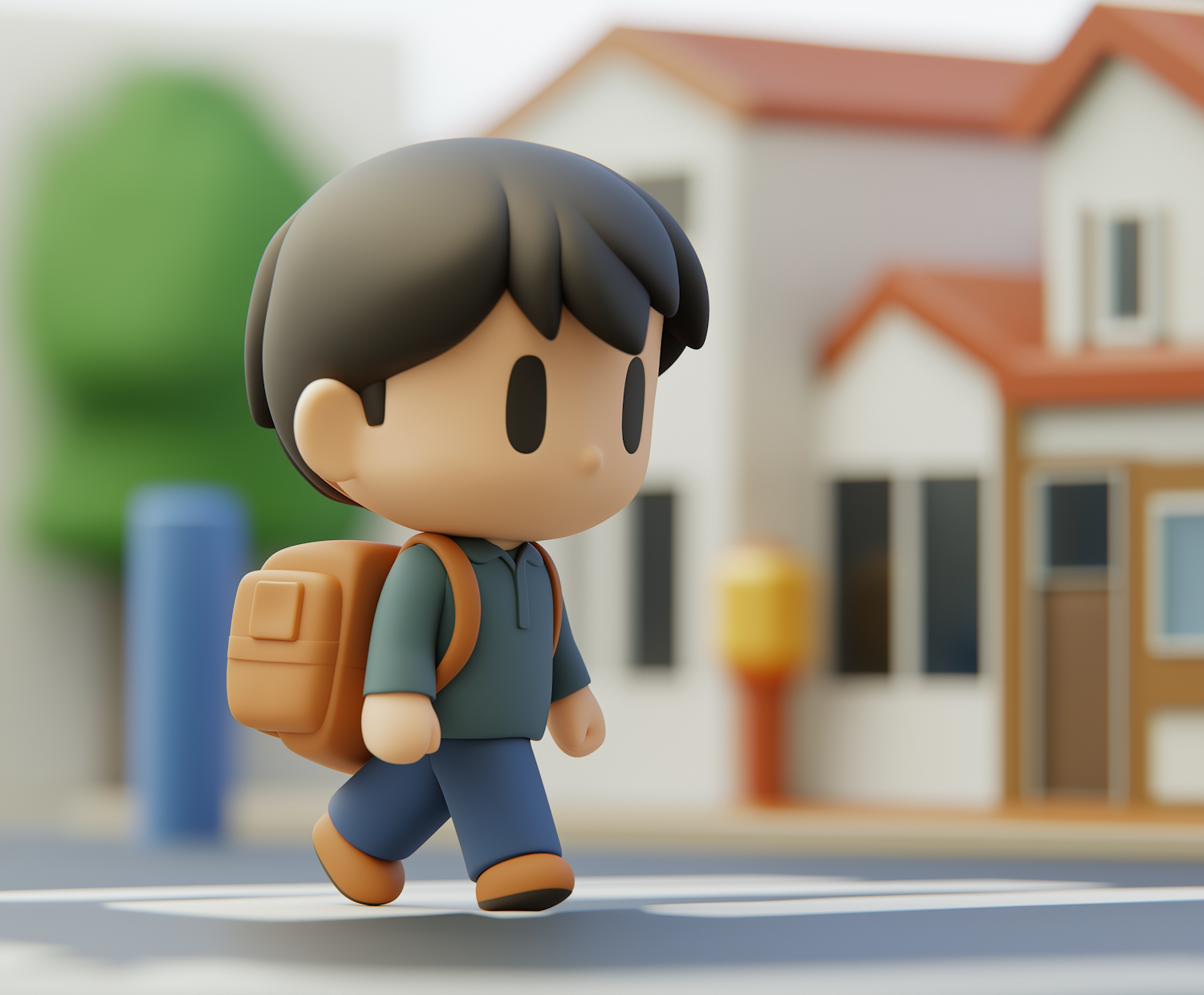 Adorable cartoon character with a backpack walking in a suburban setting, featuring soft pastel colors and a cute design.